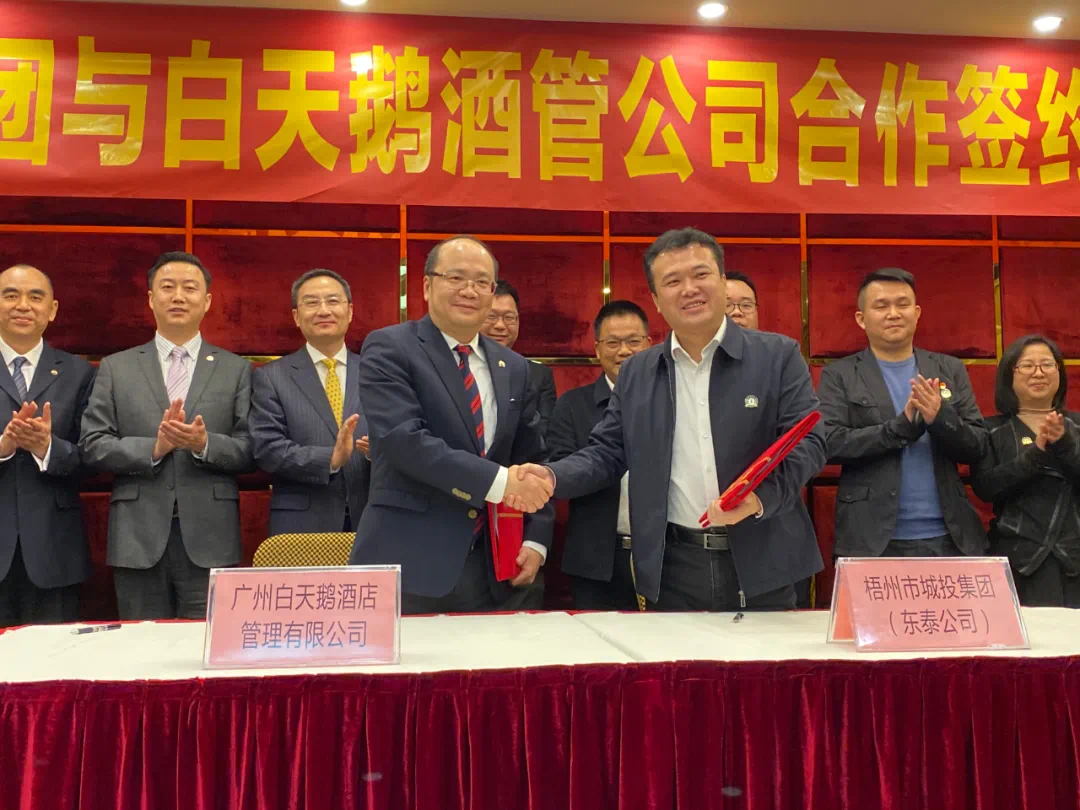 3月31日,白天鹅酒店管理公司与梧州市城建投资发展集团在梧州江滨国际大酒店举行酒店项目合作签约仪式,意味着城投集团委托管理方广州白天鹅酒店管理公司正式全面接手酒店管理经营。