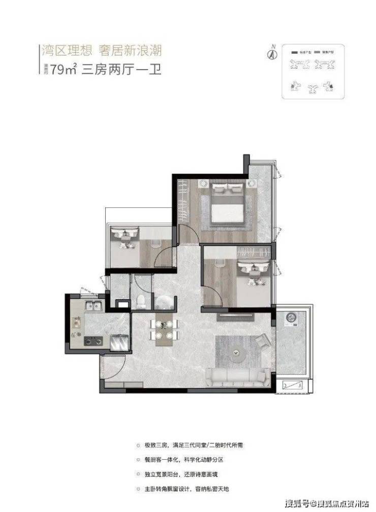 在售面积:79m²(3室2厅1卫)、89m²(3室2厅2卫竖厅)、89m²(3室2厅2卫横厅)、105m²(4室2厅2卫)