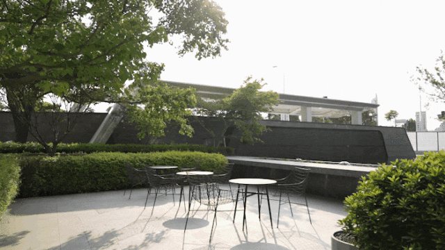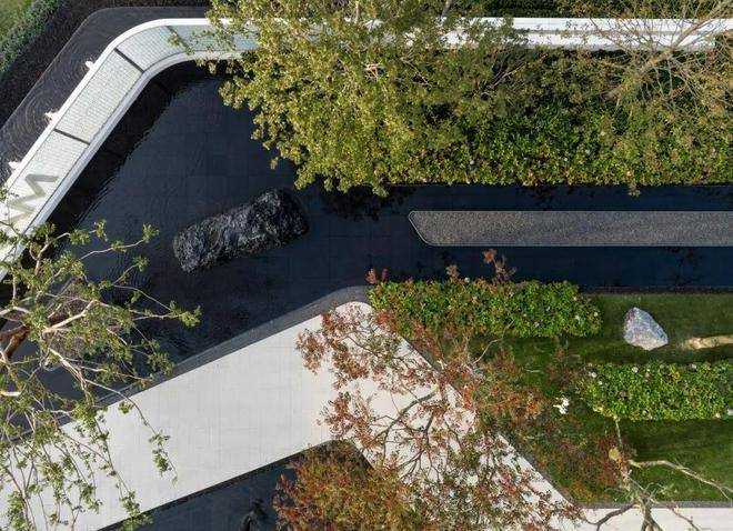 洽谈区掩映在绣球花径与娜塔栎的树影婆娑之中,水系环绕,背靠浓密的植物背景,打造静谧的户外会客空间,将人们带入一个诗意与雅致并存的境地。悬浮于水面的苔藓案台,从远处的水景一直延伸到会客区中央,与潺潺涌泉、天然置石、雅致植物相结合,如精致盆景一般的微观山水,展现山水美学的精髓和品味。一抹浮苔,将会客区的视线引向远处的景观,营造疏朗惬意相互渗透的空间。