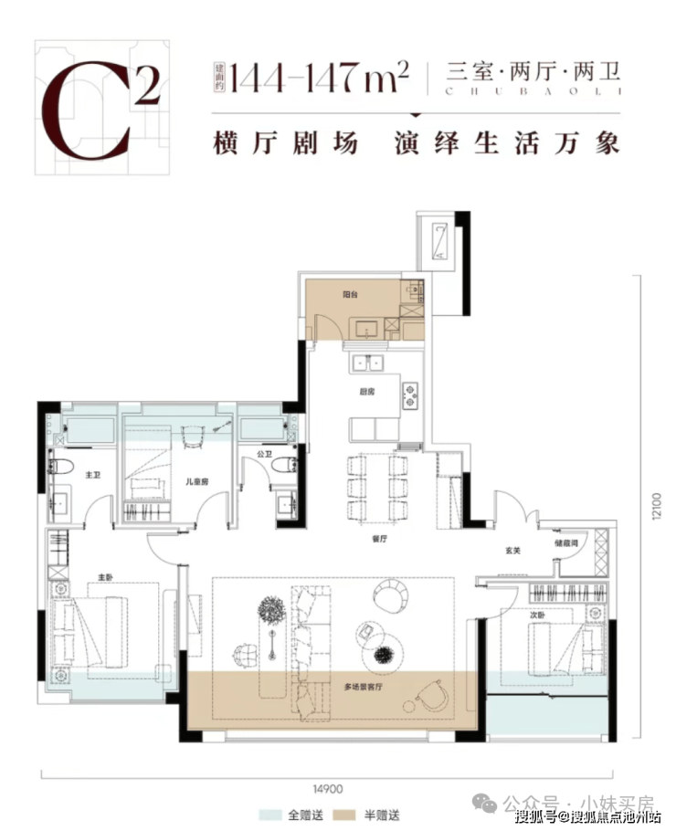 位于12号楼内,也是三开间朝南、带南北双阳台的布局,南向面宽约12.1米,尺寸更优秀,大横厅轻松get;三个卧室均带飘窗,此外,次卫内也有一个飘窗赠送,整体可拓展面积较106平户型更多。