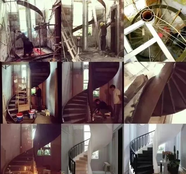 楼梯用两层中间镂空的钢柱来承重,通过精密的计算,将钢柱切割成一个扭曲旋转的造型,然后再打磨、上色完成。