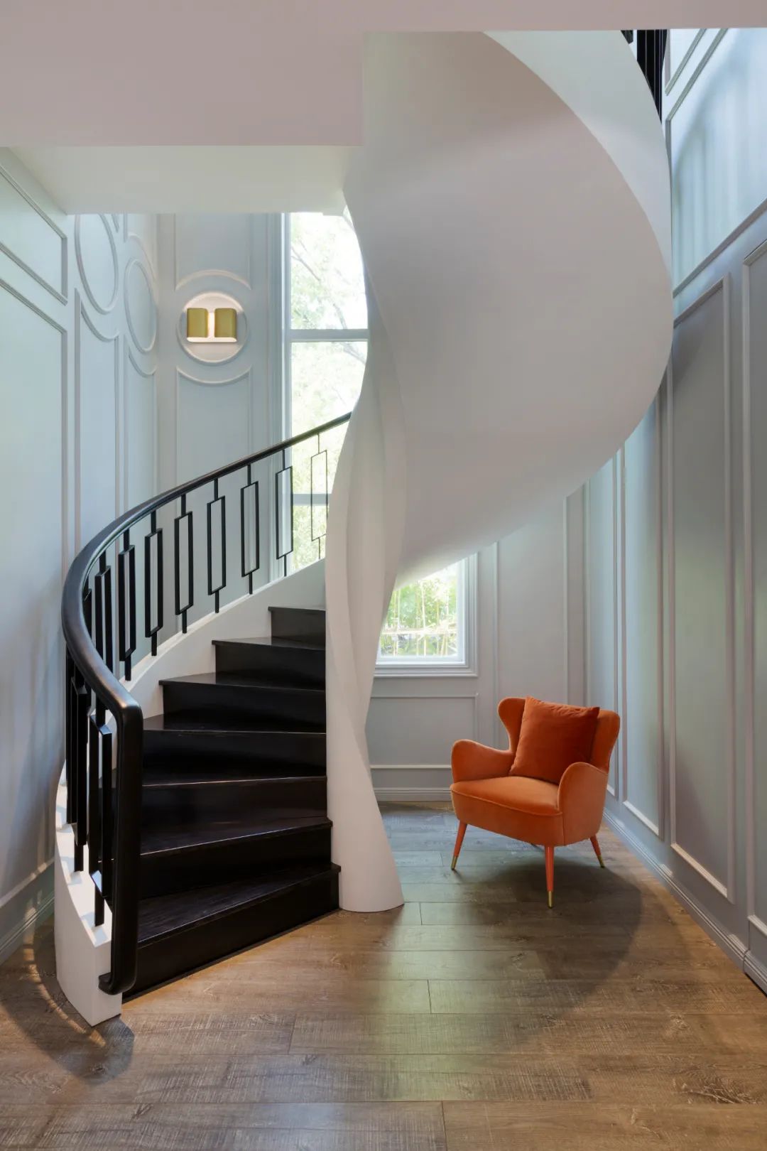 楼梯的设计是业主最满意的地方,这里承上启下,至关重要。优美的线条,黑白质感的对比,如同一位优雅的舞者旋转,再旋转,娓娓而上。