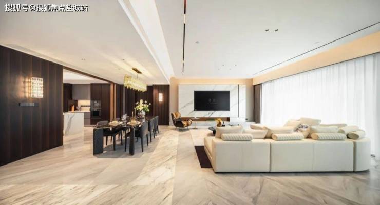 客厅背景墙更像是一场世界顶级石材展览,西边套用的是巴西进口石材天宝石,高贵中带着优雅;东边套用的是意大利卡拉拉大理石中的顶级「雕刻白」系列,我们熟知的世界著名雕塑《大卫》雕塑、世界著名建筑比萨斜塔等等,用的就是这一种石材。