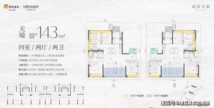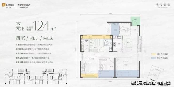 武汉天宸1、3号楼高层主打143平户型,两梯两户布局,5号楼高层主打124平户型(两种户型布局),两梯三户布局;