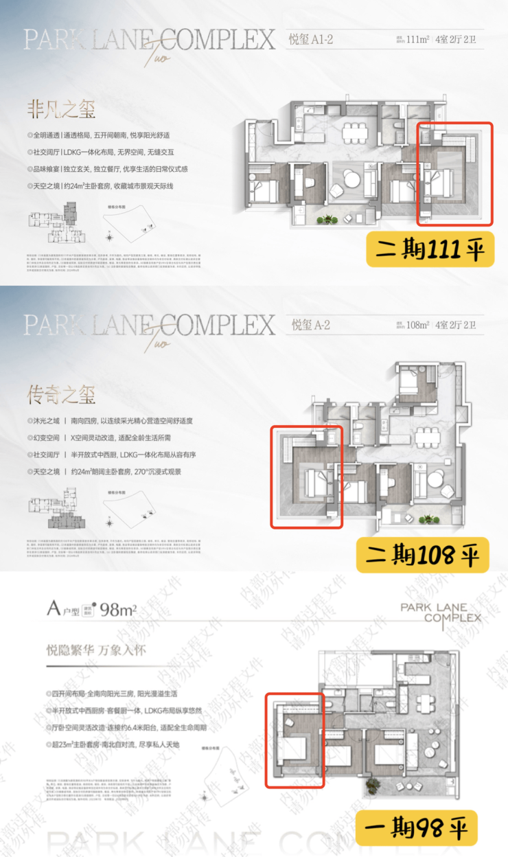 二期在售户型如下,建面约108-111-124平全南向纯四房。