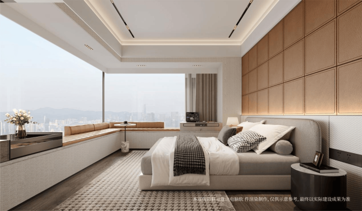 这回二期新上的产品,主卧基本全是采用全新的研发成果——天空之境,即270度U型无遮挡柱的全画幅飘窗景观。