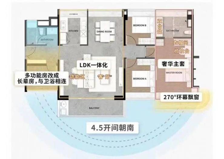 整体价值:约46㎡客餐厨空间+约26㎡南北对流主卧套房+4开间朝南+约14.5米南向采光面
