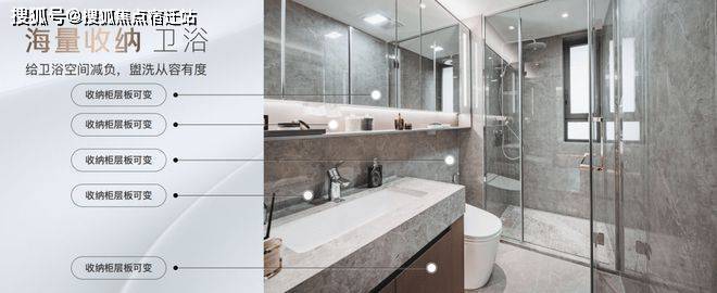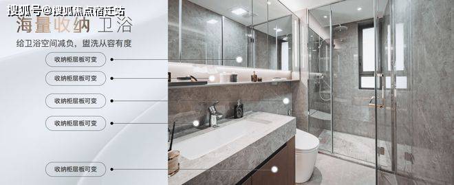 卫浴收纳系统:可抽拉龙头、收纳柜层板可变式设计、金属拉篮式设计、预置吹风机器、270°镜、防雾镜、美颜灯等;