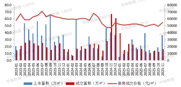 新房市场:根据中指数据库监测,11月1日至26日,深圳新房住宅成交2038套/21.43万平方米,新批准上市商品住宅共计2463套/36.44万平方米。11月深圳新房市场供应与成交均处低位,但环比均小幅回升,显示市场底部企稳迹象。豪宅市场表现亮眼,深圳湾·澐玺开盘单日销售额达130亿元,创2025年全国单盘销售纪录。刚需市场以价换量保持稳定,部分项目去化亮眼,如深铁珑境II云赋首日去化超60%。区域上龙岗、龙华、宝安贡献主要成交,南山推出安居型商品房且申购条件放宽,吸引刚需及人才关注。9·29新政效果持续显现,市场信心明显提升,但仍处于弱复苏阶段,市场整体仍显谨慎。11月深圳新开盘项目普遍采用8.5-9.5折综合折扣,部分项目低至8.3折。主流促销形式为"冻资+开盘+签约"三重折扣叠加,辅以首付分期、赠送精装等增值服务。11月深圳新房均价受高端项目拉动维持稳定,市场正处于调整期并逐步寻找支撑点,12月将迎来新一波推盘高峰,顶豪与刚需盘齐发,叠加房企年终冲刺促销,成交规模或进一步攀升。