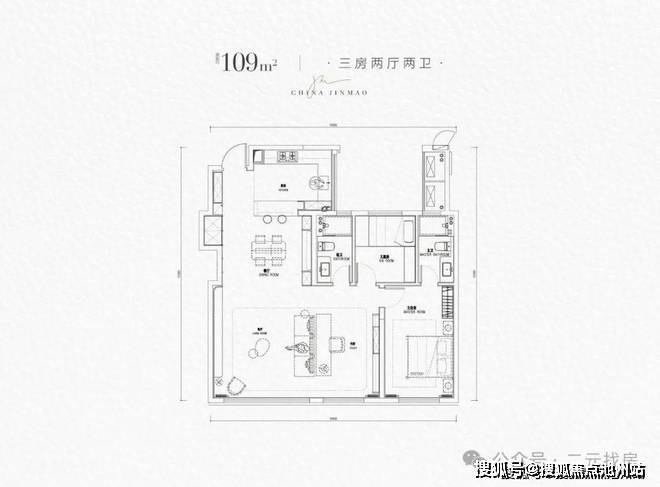 109㎡户型,是一个三房两厅两卫,三开间朝南,动静分离。