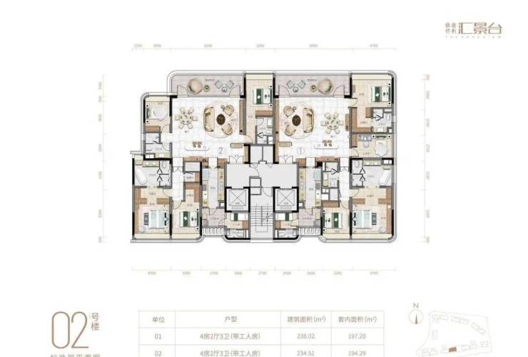 项目由14栋12层小高层组成,产品涵盖123-352㎡三至五房,共8类户型,户型实用率约82-84%