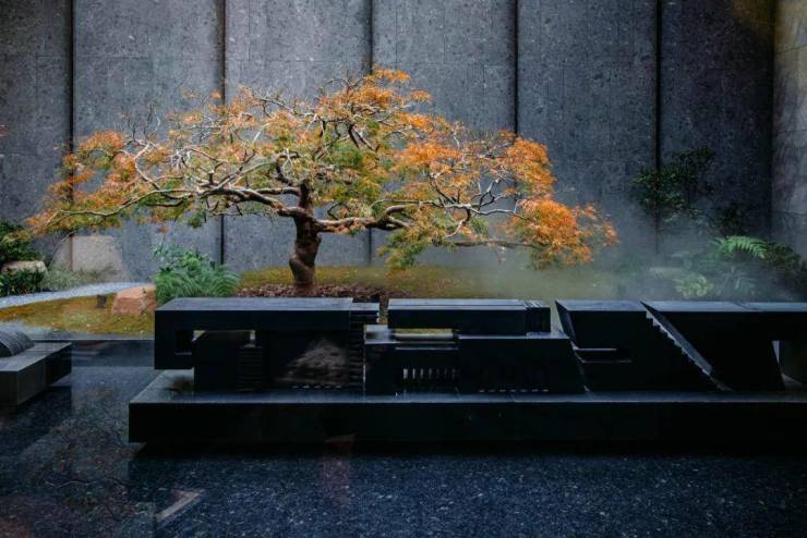 闯入眼帘的是满眼翠绿,据了解,园林中几乎每棵树都是设计师专门挑选的,羽毛枫、紫薇等上百种灌木被妥善安置,有的花期长达百天,让时间尽可能地停留在盎然绿意中。