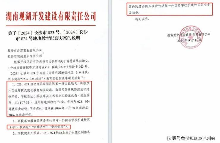 项目已确定配套入读青竹湖湘一外国语学校扩建校区,学校当前已开工建设,计划于2026年秋季开学。