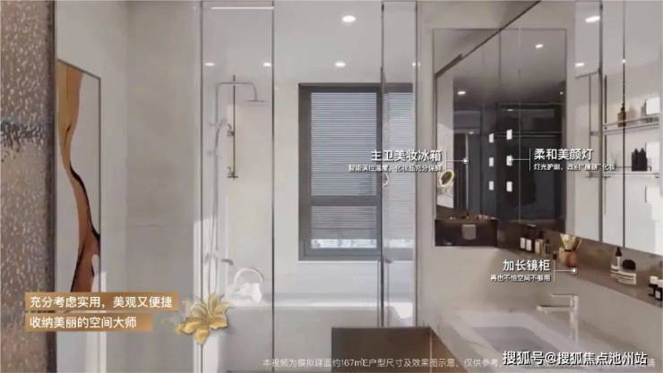 主卧卫浴交付容量约1.07m³≈24个20寸登机箱大小(注:以建筑面积约167m²BRIGHT户型计)。自带美妆冰箱,带智能控温功能,为女主人留住无惧时光的优雅与美丽。