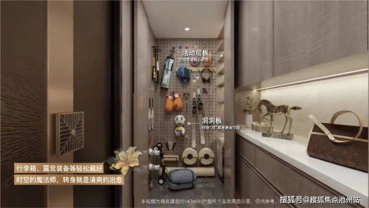 “万物仓”升级呈现,交付容量约2.419m³≈54个20寸登机箱大小(注:以建筑面积约143m²BRIGHT户型计),装满全家人志趣好物,设计洞洞板&活动层板,让使用更便捷。