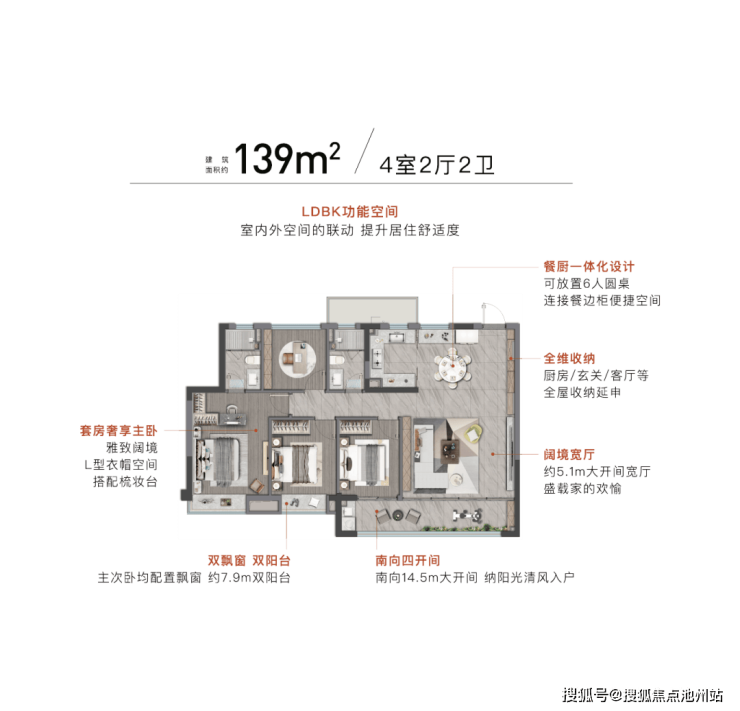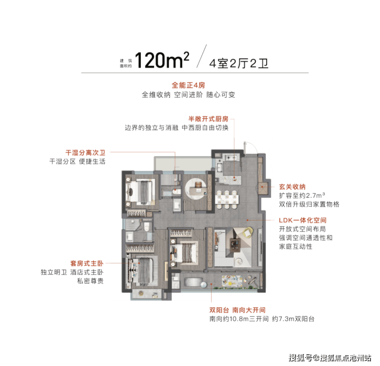 新奢生活观&新奢人居观:恒温泳池、行政酒廊、活力健身房、漂浮瑜伽室等组成的架空层泛会所,重构了社区社交与健康生活场景;而建面约120㎡正四房“会成长的家”,则以极致的空间格局和生长性,解决了全龄段家庭的核心痛点与情感需求。