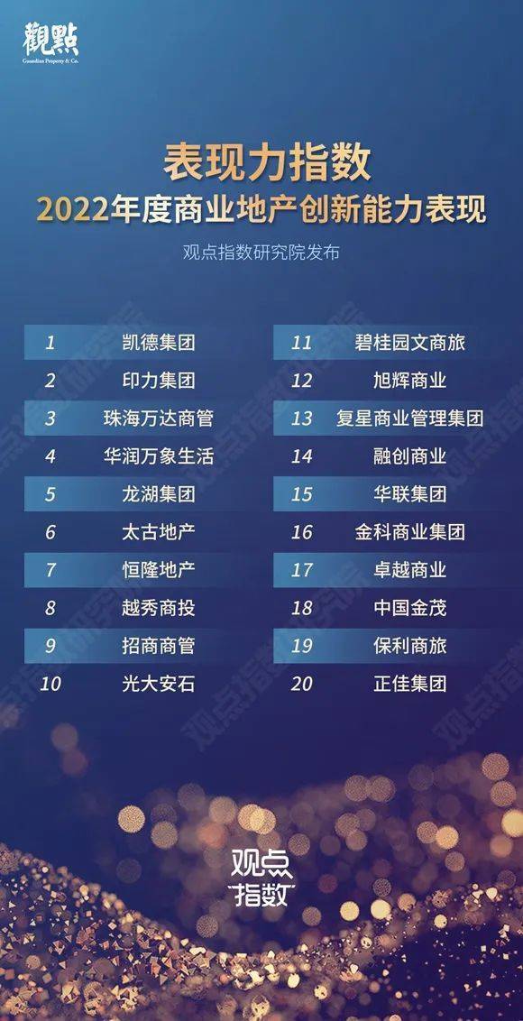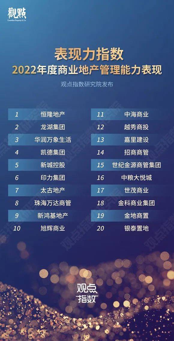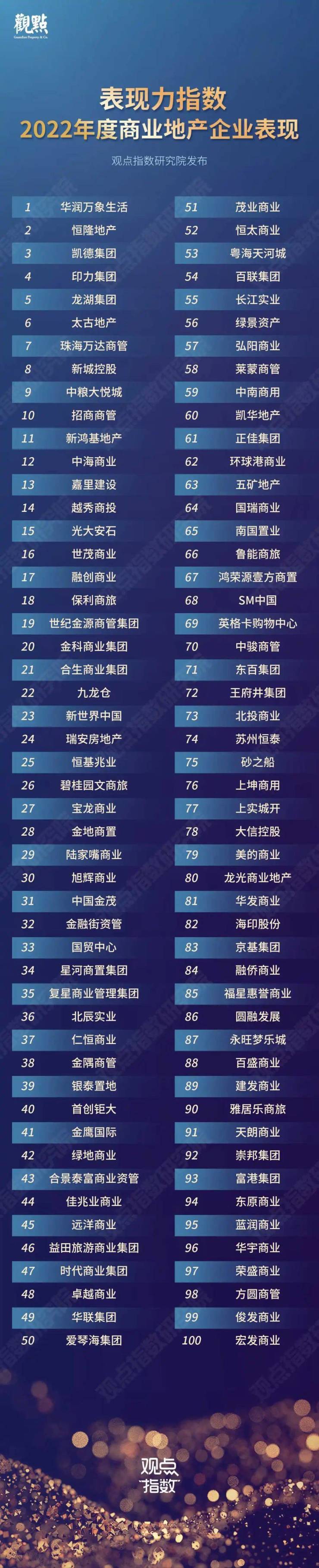 观点指数通过对2022年度商业地产市场的表现进行研究,发布"表现力指数·2022年度商业地产企业表现"研究成果。其中,华润万象生活、恒隆地产、凯德集团表现出色,在研究成果名单中居于前位。