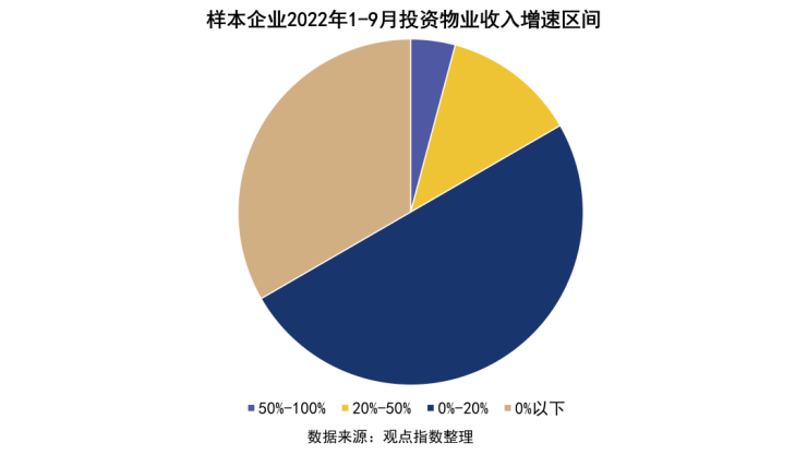在样本池中,观点指数选取了24家具有代表性的企业,以此聚焦观察2022年的企业表现。可以看到,样本企业投资物业收入跨度从5亿元到逾百亿元不等。其中营收超100亿的企业仅有1家,50-100亿区间的企业3家,10-50亿元的企业15家,10亿以下的企业5家。