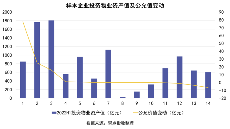 为了更具体分析企业的投资物业资产值情况,观点指数在研究样本中抽取了14家上市企业进行对比分析。