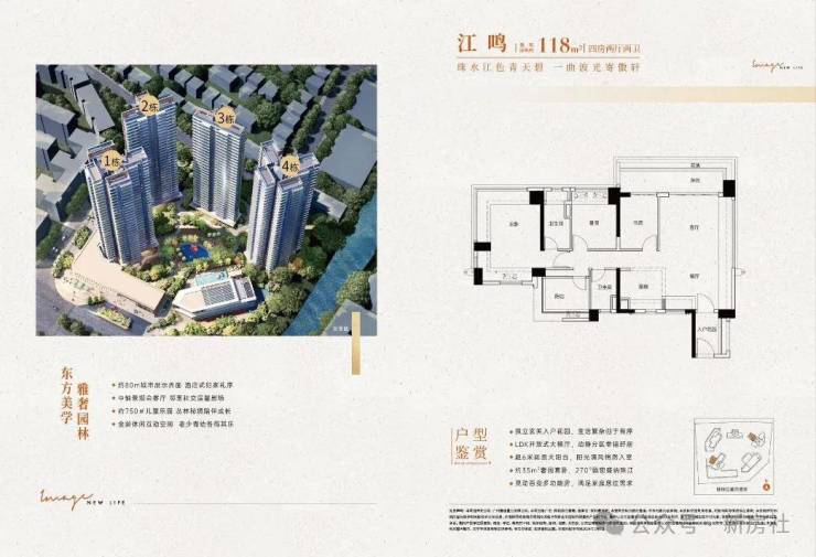保利滨江和著属于一个刚改、改善定位的产品。整体规划4栋住宅+6班幼儿园+部分底商,共有塔楼、板楼两种格局,主推建面约86-140㎡三至四房,户户朝南,使用率100%+,也是万博唯一270°环幕江景盘!