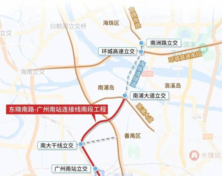 东晓南路 - 广州南站连接线南段将在 2025 年与海珠湾隧道同时建成通车,实现南站和海珠城区约 15 分钟互通,30 分钟连通珠江新城 CBD。
