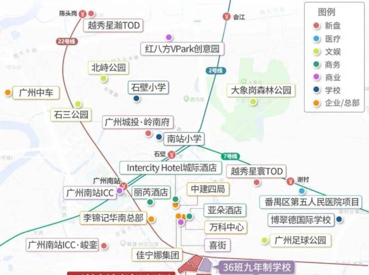 商场:北临新鸿基 ICC(建设中)、南站花城汇(待开放)、南站喜街(已经开业)等商圈,还能乘坐地铁去往万博的天河城、K11、华润万象系商业等,此外,小区附近约 2.5 公里处还有雄峰城。
