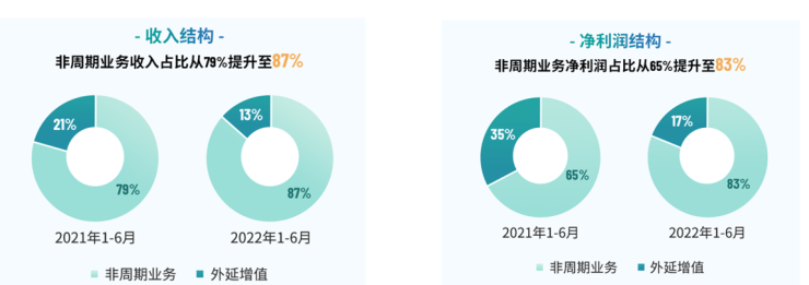 上半年,雅生活盈利结构持续优化,可持续增长韧性凸显。物业管理、业主增值服务和城市服务三大非周期性业务整体营收达66.3亿元,同比上升34.1%,占比从79%提升至87%;净利润为9.5亿元,同比上升13.8%,占比从65%提升至83%