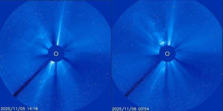 11月6日,据中国气象局国家空间天气监测预警中心消息,未来3天或现大地磁暴。北京时间11月5日晚间19时19分以及11月6日的清晨06时07分,太阳再次耀斑两连暴,最大强度分别为M7.4级和M8.6级,并伴随较为明显的日冕物质抛射(CME)。