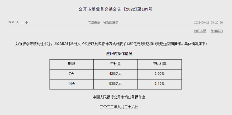 焦点财经讯 耿宸斐 为维护季末流动性平稳,2022年9月26日人民银行以利率招标方式开展了1350亿元7天期和14天期逆回购操作。
