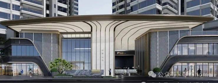 中建天钰主入口采用酒店式落客区设计,进入小区前,必须穿过拥有高透外立面的归家大堂,约9米的挑高,竖向尺度上便拉满了酒店迎宾感。