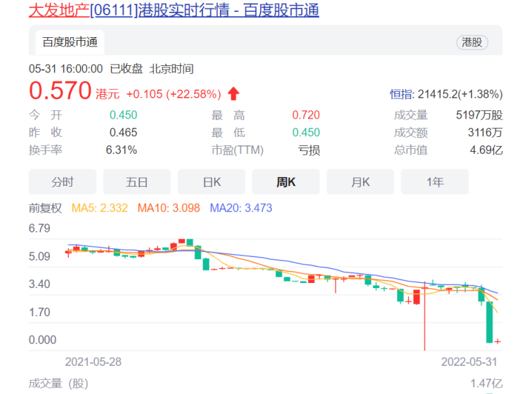事实上,4月以来天誉置业遭遇股价断崖式“跳水”,而大发地产股价“闪崩”似乎与此前的“清盘呈请”密切相关。只不过,幸运的是,大发地产的股价在5月31日迎来回弹,盘中涨幅一度超40%,截至收盘,股价上涨22.58%。