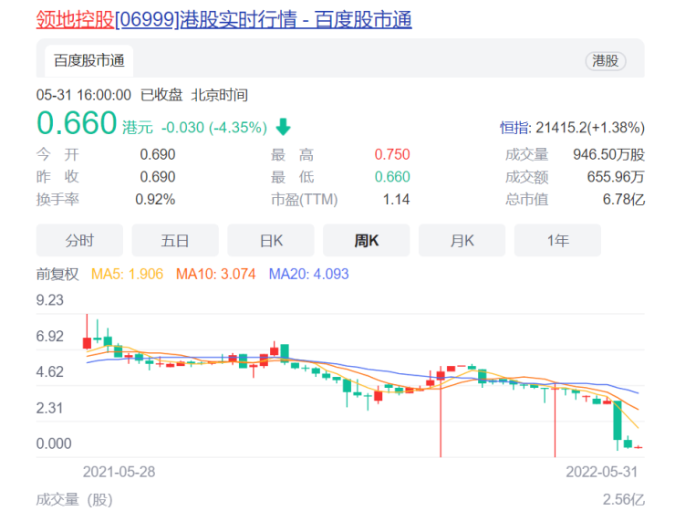 佳源国际遭遇股价闪崩的时间是5月18日,较低下探0.56港元/股,当日收跌41.41%。5月19日,领地控股和领悦服务集团(02165.HK)股价均遭遇大跌,截至当日收盘,跌幅分别为83.82%、59.6%,创上市以来新低。