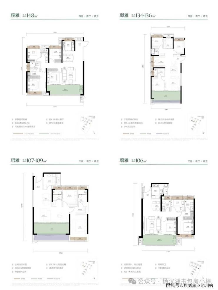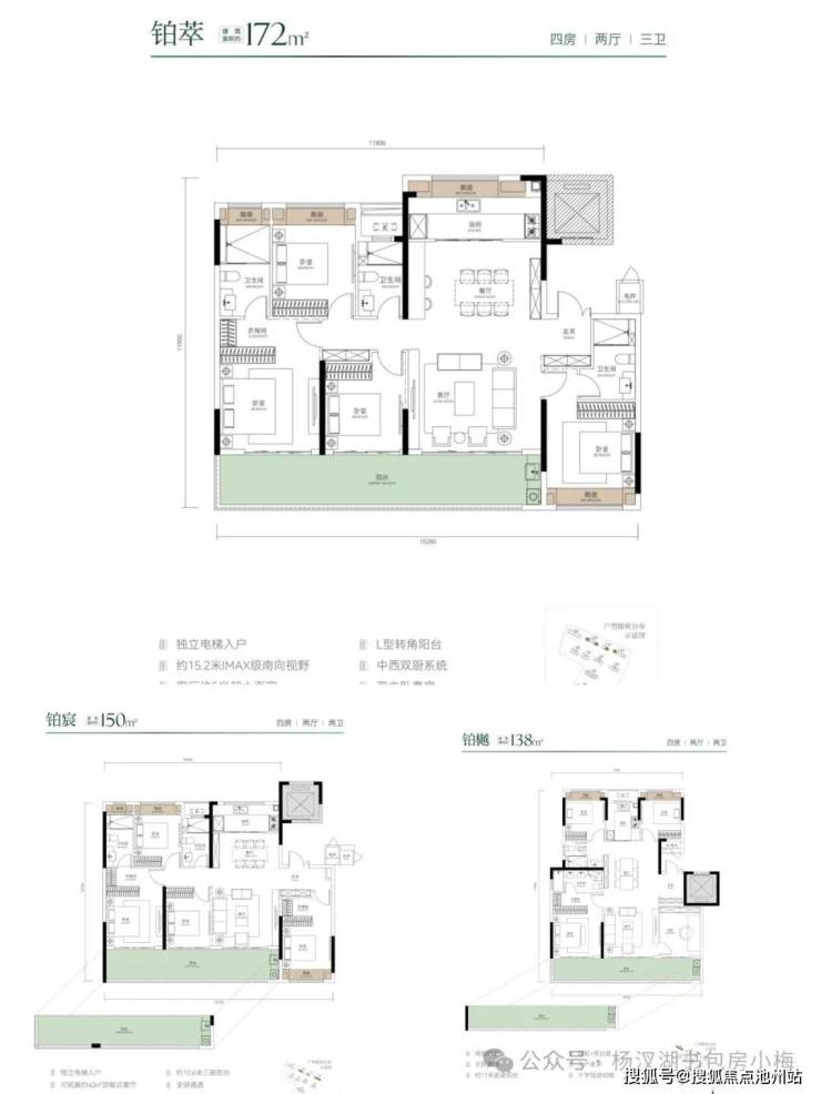 项目已出户型有7种,小高层区域为138㎡(铂樾)、150㎡(铂宸)、172㎡(铂萃)三种户型,高层与超高层区域分为106㎡A(瑞雅)、106㎡B(珺雅)、137㎡(璟雅)、148㎡(璞雅)4种户型