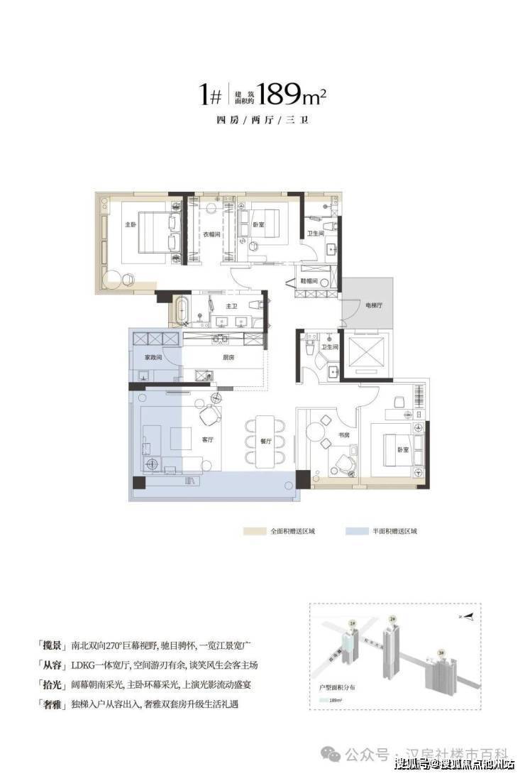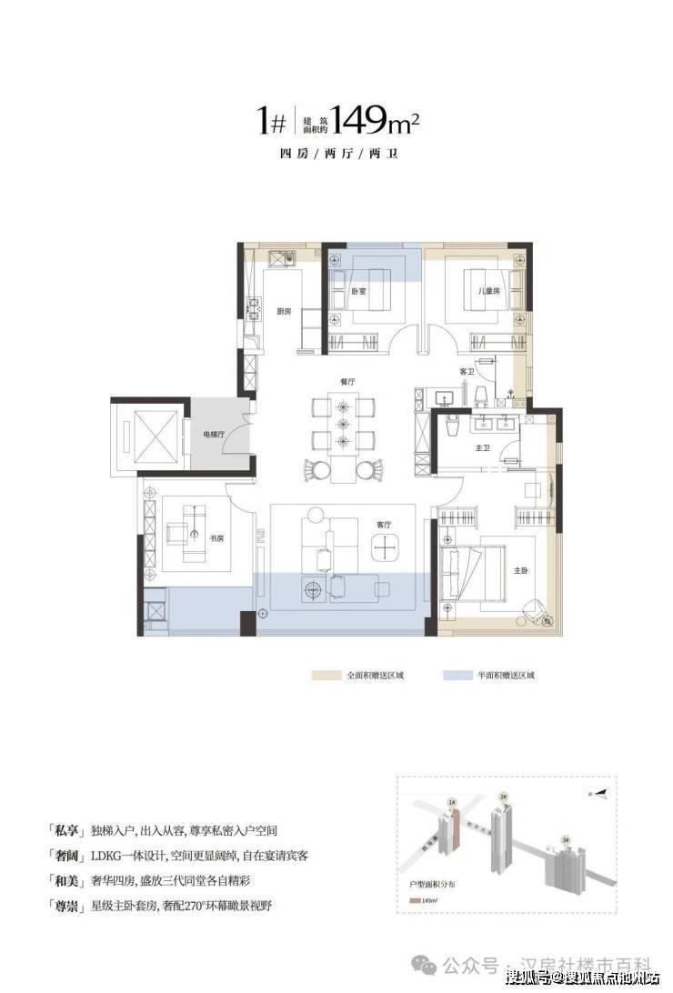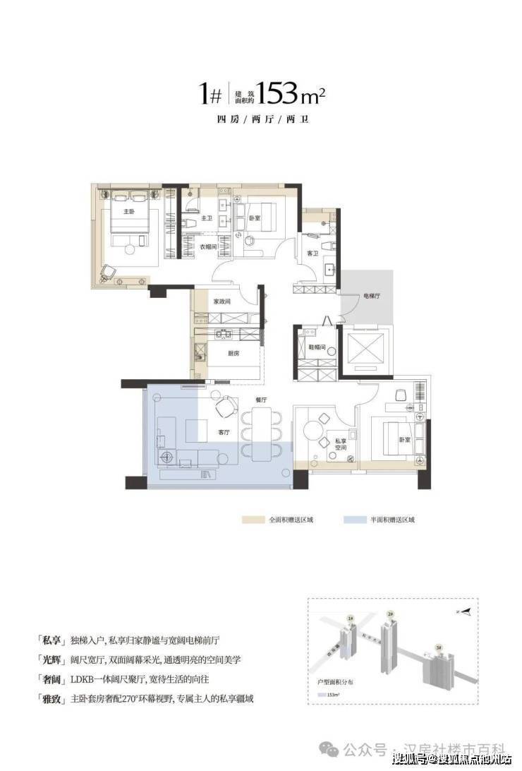 该户型位于1号楼的东边户,超宽大开间,餐客厅、主卧全朝南,整体也是大四房的设计,主卧还有 270° 的全景舱视野,阳台的优化面积也很大。门口也有独立的入户电梯厅,归家私密感很足。