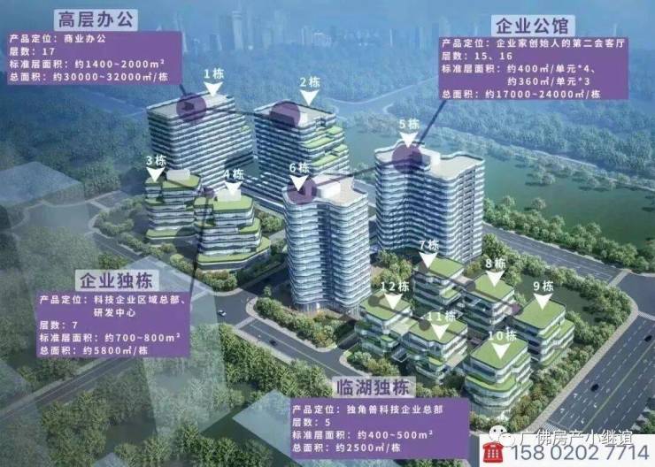 由12栋单体组成,含括临湖独栋(2300-2700㎡)、瞰湖工作室(350-390㎡)、平层办公(300-2000㎡)、湾区会客厅(400/800㎡)等多种建筑形态。