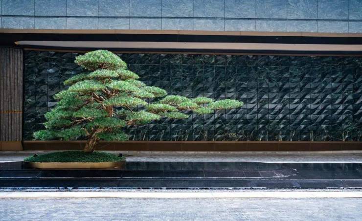 在下沉式庭院中央,一棵约5米高的迎客松巍然矗立,搭配普拉达绿的奢石背景墙,成为引人注目的景观焦点。它不仅是一道独特的风景线,更是岭南建筑特色“四水归堂”理念的重要体现。与无边界的流水相映成趣,营造出松韵、水波、月影交融的意境。罗汉雕塑、水景与玻璃幕墙巧妙融合,在阳光洒落的天井中,与自然展开一场静谧的对话。