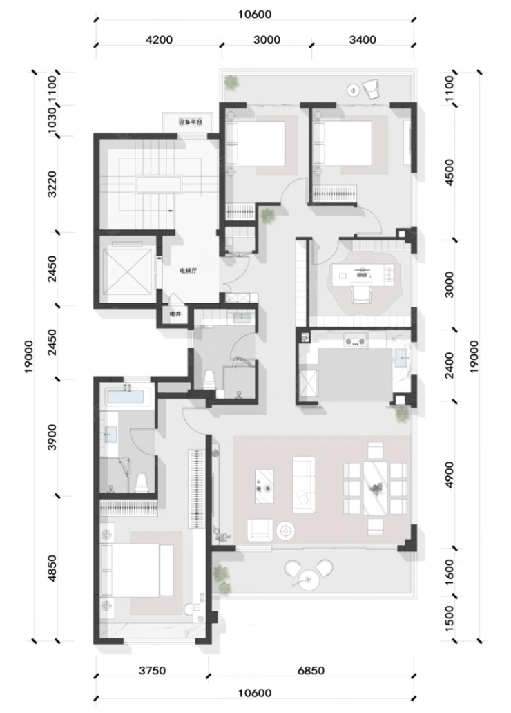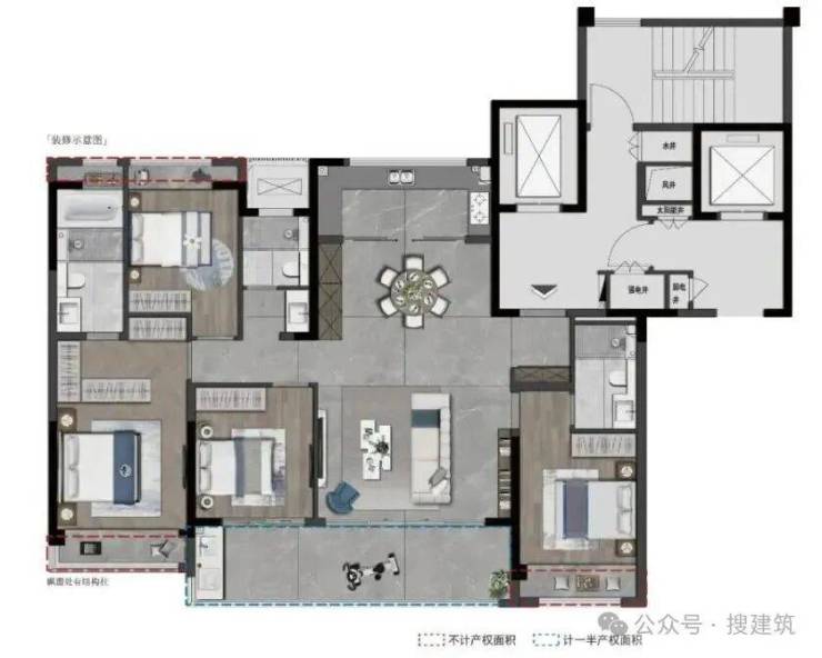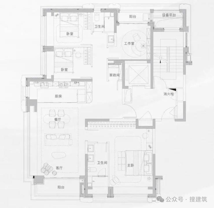 主卧套房开间约3.6米,进深超过8.4米,开间进深比合理,有一定的私密性。而北侧赠送的设备平台开间约6.2米,剔除空调机位后也有约4.4米的可利用开间。