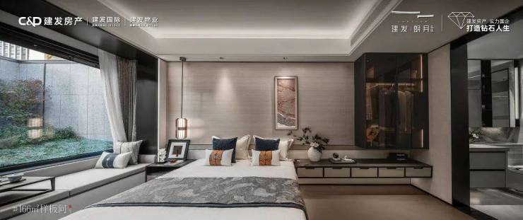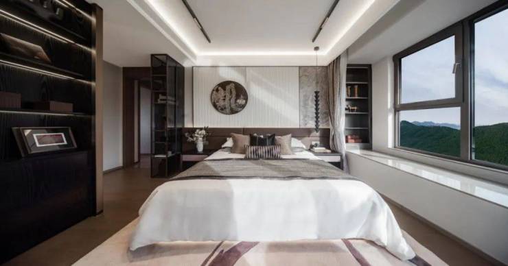 南向主人套房主卧,建面约3.5m宽飘窗,突破性采用与开间同宽设计,视野无墙体边框拘束,主卧卫生间浴缸一侧打造北向飘窗,给主人泡澡时看星空的别样浪漫体验。