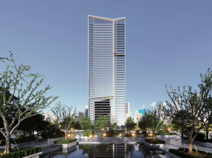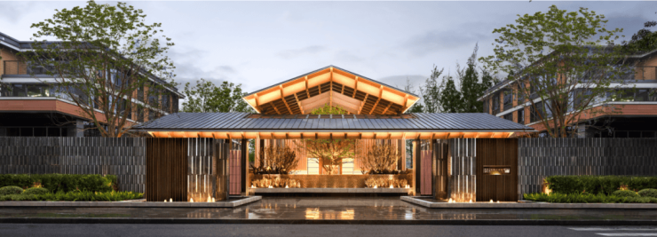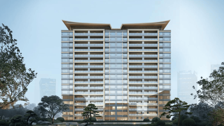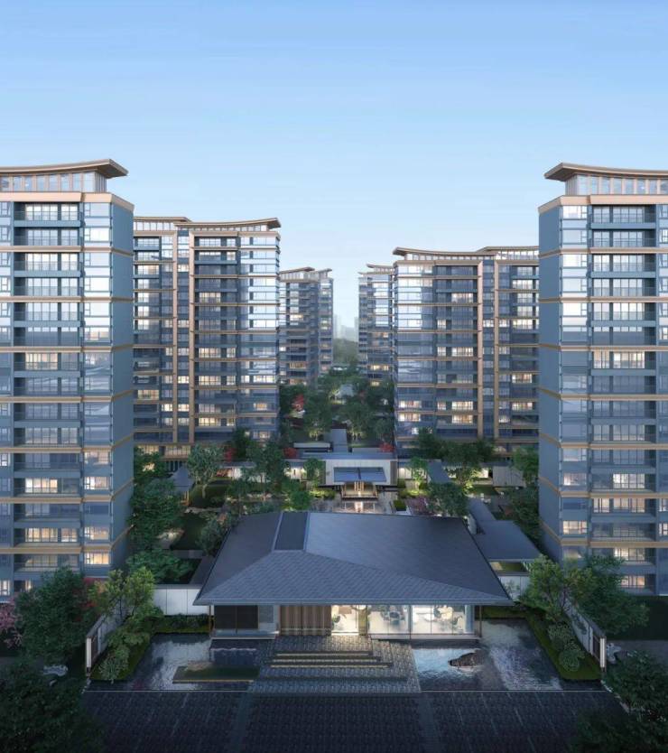 项目打造现代简约中式立面,从传统凤鸟纹和玉琮器物提取灵感,筑造“凤鸟冠顶”和“玉琮立面”,庄重典雅不失灵动,犹如凤鸟展翅,扶摇直上。
