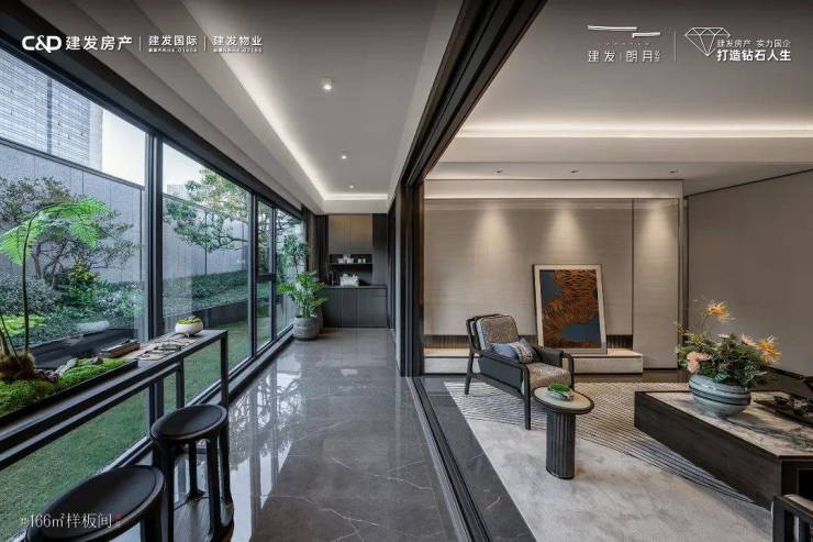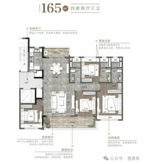 成都万科古翠隐秀建面约156㎡户型,属于端厅户型,约270°的环幕视野,使其可以实现三面采光,连续的采光面长度可以达到约35米。