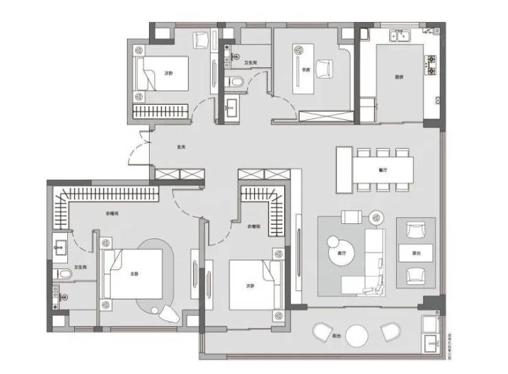 这个户型重点是星级主卧套房,270°环景飘窗、独立卫浴(五件套)、衣帽间,同时还可以利用飘窗位做书桌。无论是视觉空间还是采光通透,均得到升级,为居者带来不一样的居住感受。