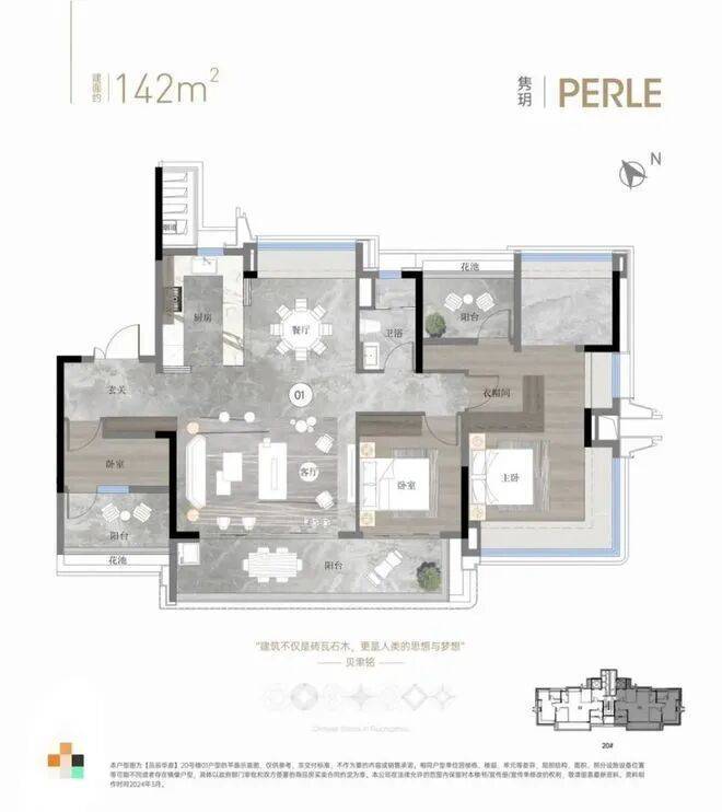 230平户型拥有私家电梯厅、双主套、独立佣人房、南北对流、LDKB大方厅、主卧L型270°飘窗等,大大提升了整体的空间体验。