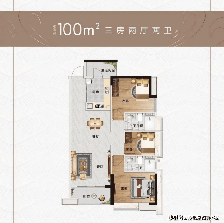 产品方面,100㎡三房客餐厅空间充裕,厨房连接生活阳台较为实用。卧室集中分布在客餐厅后面的设计,虽然增强了三间卧室的私密性,但也造成了通道空间的浪费,中间次卧面积较小。