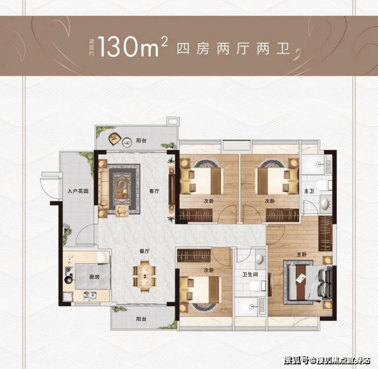 130㎡四房,入户花园面积较大,两个阳台南北对流,四个卧室面积均匀。