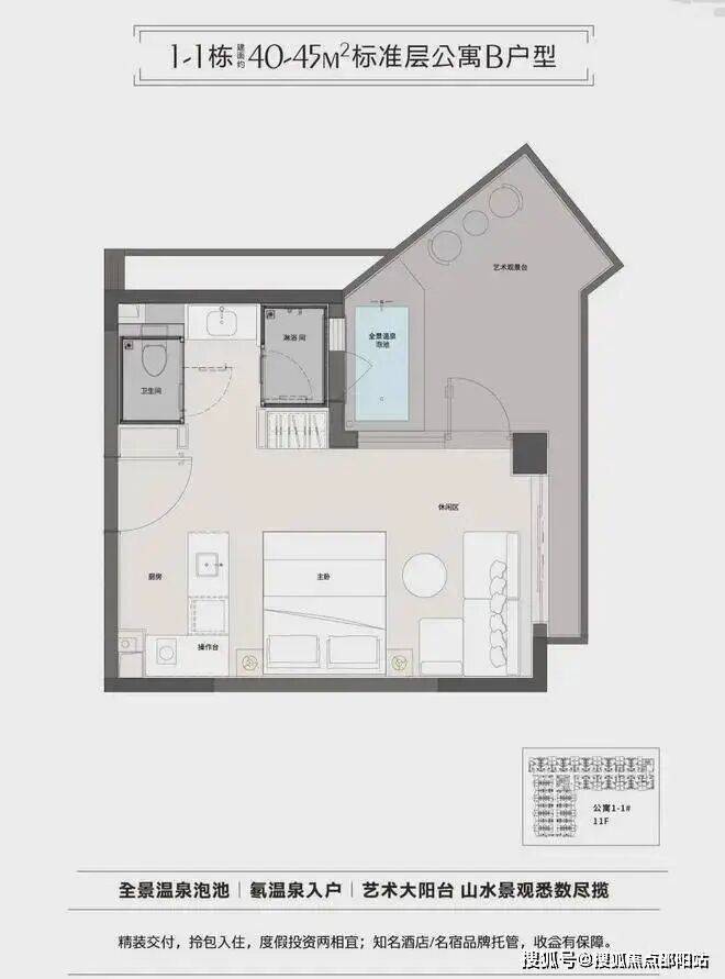 建面约35-45㎡,统一按高标准精装交付,送景观温泉泡池。
