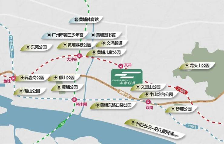 未来方洲项目周边配套丰富,优越的交通、教育、医疗、商业等资源,满足居民的各类需求。项目周边拥有双地铁5号线和13号线,出行便捷,珠金琶通勤圈内的商务及金融中心快速连接。项目邻近万象系商业体、文冲东、双沙大型购物商场等,提供完善的购物、休闲、娱乐设施。周边教育资源也十分丰富,未来方洲规划了4所中小学、4所幼儿园,打造12年优质教育体系,进一步提升区域的居住吸引力。