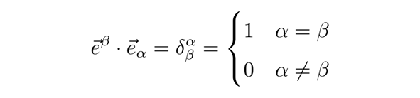 如何求得其展开系数呢?此时,我们可以定义一组与基矢对应的对偶基矢,使得对偶基矢与基矢之间满足正交归一的性质: