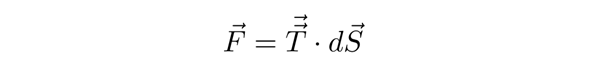 对于上述变换关系,我们既可以理解为:T是二阶张量,dS是一阶张量,缩并一次减少两个指标,因此得到的结果为2+1-2=1阶张量。也可以从线性变换的角度,T作为线性变换的矩阵,将单位面积的微元矢量dS变成其所受的力。