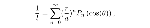 在之前的物理课中,我们曾计算过月球对地球的潮汐作用,地球上一点到月球中心的距离的倒数可以用勒让德多项式展开,