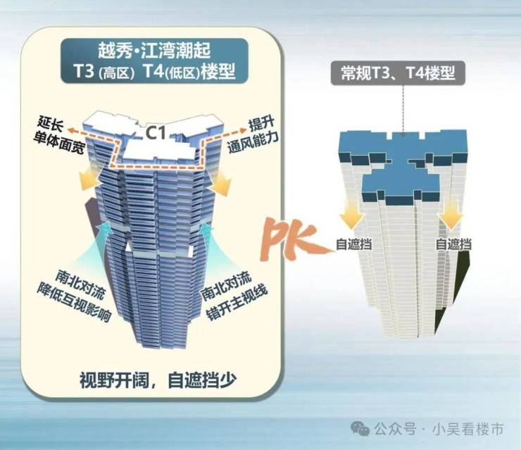 为了优化采光通风及提升窗景,越秀·江湾潮起对楼栋结构进行创新,第一个好处,户户都是理论上的边套和多面采光,让单体面宽延长之余,通风能力得到有效保证。